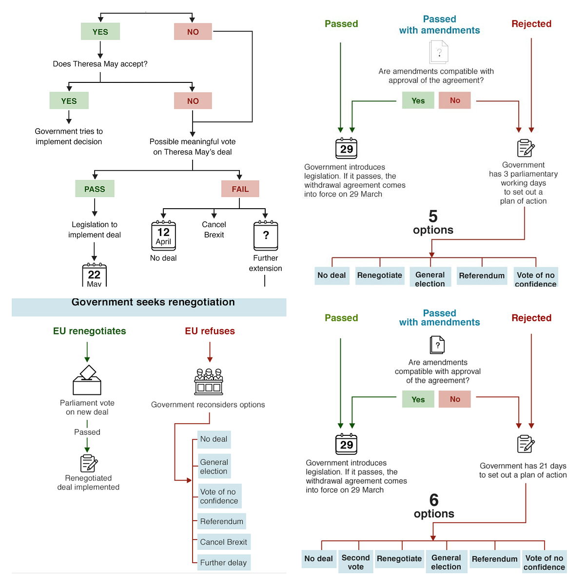 Ha az éppen aktuális határidő lejártához közelít a folyamat és nem látszik a megegyezés esélye, akkor a parlament és/vagy a brit kormány kérhet haladékot az EU-tól. Mivel ez eddig már kétszer megtörtént, feltehetően harmadik alkalommal nehezebb, ha nem lehetetlen lesz további halogatásra bírni az EU-t, bár Ursula von der Leyen, az Európai Bizottság újdonsült elnöke hajlandó lenne halasztani egy jobb megegyezés érdekében. Kétséges azonban, hogy a további halogatás eredményre vezet-e, hiszen az EU és a brit kormány és/vagy parlament álláspontja alig mozdult 2018 novembere óta.