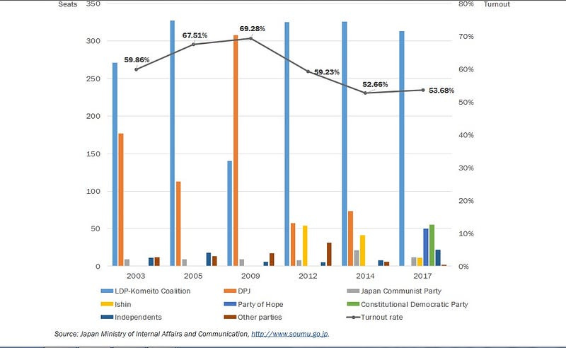A kezdetben rurális bázisra támaszkodó LDP a 70-es évekre sikeresen stabilizálta a helyzetét, miközben a szocialisták a középre húzással nem voltak elég markánsak, a baloldalibb irányzat pedig túl radikálisnak bizonyult a növekvő, városiasodó középosztály szavazatainak becsatornázására (Chiavacci, 2010). Időközben pedig a gazdasági világválság és a fukushima katasztrófa idején szocializálódott új generáció a korábbiaknál is konzervatívabb preferenciákkal rendelkezik: ha nem is értékrendi alapon (hiszen a nők vagy kisebbségek helyzetét illetően inkább liberálisabbak), sokkal inkább az LDP kínálta stabilitás fontos a szüleiknél kockázatkerülőbbnek mutatkozó korosztálynak. Ennek következtében az LDP az utóbbi egy évtizedben különösen a fiatalok körében tudott újabb szavazókat szerezni a meglévők mellé, míg a baloldali ellenzéki pártok korfája az idősebbek felé tolódott el, kevés új szavazóval tudták bővíteni alap szavazótáborukat.