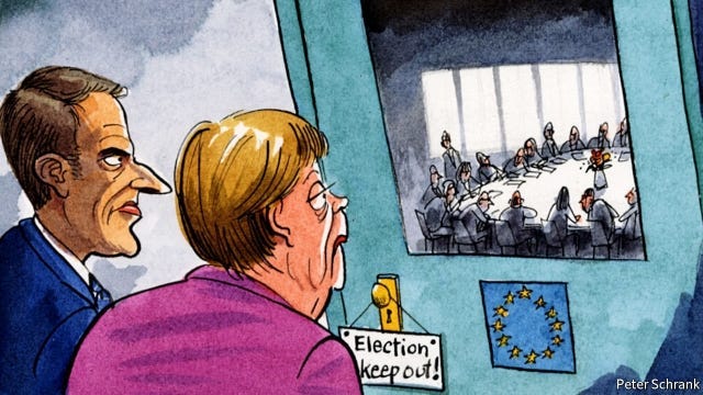 [Még egy side note: ez az a pont, ami a rövidtávú egyéni érdekek mellett még összehozhatta Macron és a V4-ek együttműködését a Spitzen-folyamat ellen. Mindkét entitás Európa-víziója nagyon eltér attól, amit a Spitzen-rendszer sugall. Macron közvetlenebb demokráciát szeretne, míg a V4-ek, de főleg Orbán és Morawiecki konföderális együttműködést. Bár egymásnak is szöges ellentéte a két vízió, annak a fajta, Macron szemében langyos, a keletieknek rossz helyről induló demokratizálódásnak mindkettő ellene van, amit a Spitzenprozess ígér. Ezért dönthetett már 2014-ben is Cameron és Orbán a folyamat ellen — természetesen más, individuálisabb érdekek mellett.]